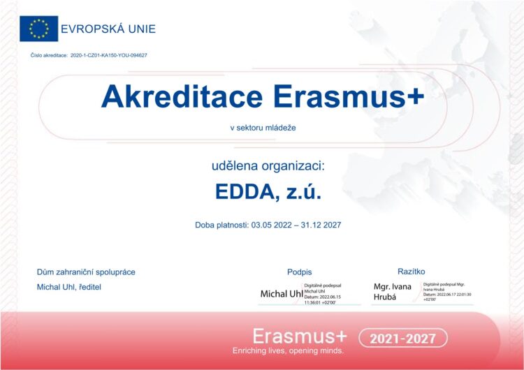 Naše organizace EDDA, z. ú. získala do roku 2027 Akreditaci ERASMUS+ v sektoru mládeže a my jsme na to náležitě pyšní.